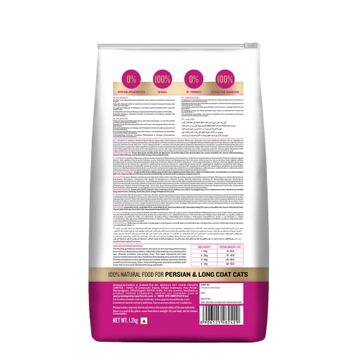 Extruded complete food for all adult true bred persian and other long coat cats. Complete care for hairball control, joint protection and immunity reinforcement through 100% natural ingredients.