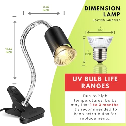Important Role – UVA and UVB play an important role in reptiles’ and Amphibians’ development and health , Come with 1PCS 75W Bulbs and a Flexible Holder It is perfect for a wide variety of tortoises, iguanas, lizards, chameleons, frogs, toads, uromastyx, chuckwallas, monitors, tegus, blue tongues, etc